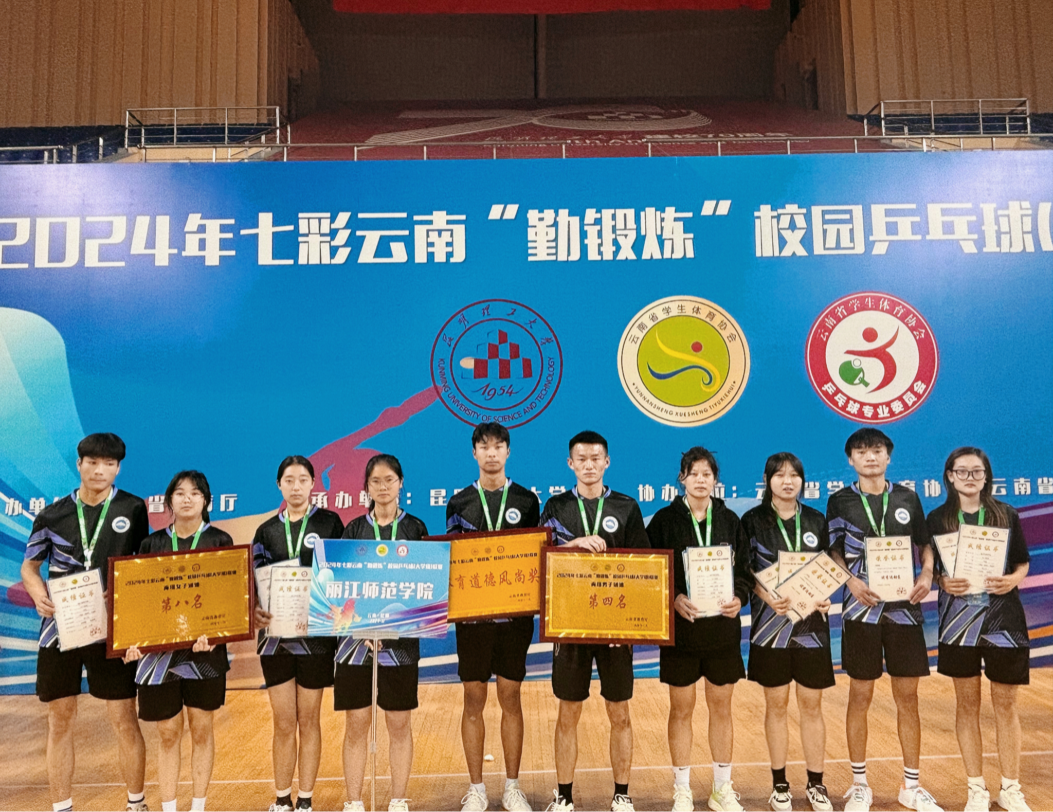 经过三天激烈角逐,我校首次参加云南省该项目的比赛,荣获丙组团体第四名、第八名,乙组单打和混双第八名以及体育道德风尚奖等奖项。这些荣誉无不体现着丽师乒乓球健儿们的不懈努力!