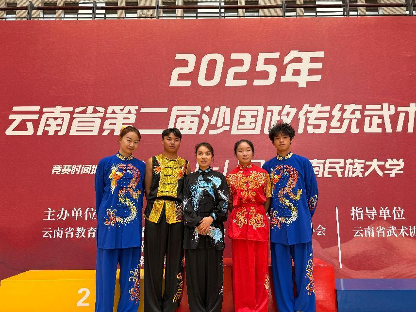 为弘扬中华武术非物质文化遗产,由云南省教育厅主办、云南省学生体育协会承办的2025年云南省沙国政传统武术比赛于5月8日至11日在昆明圆满落幕。丽江师范学院民族传统体育(武术)技能大师工作室项目负责人许俊菊老师率队出征,带领卯雨加、马思涵、蒋志豪、潘健伟四名队员组成代表队参赛,经过激烈角逐,最终载誉而归。