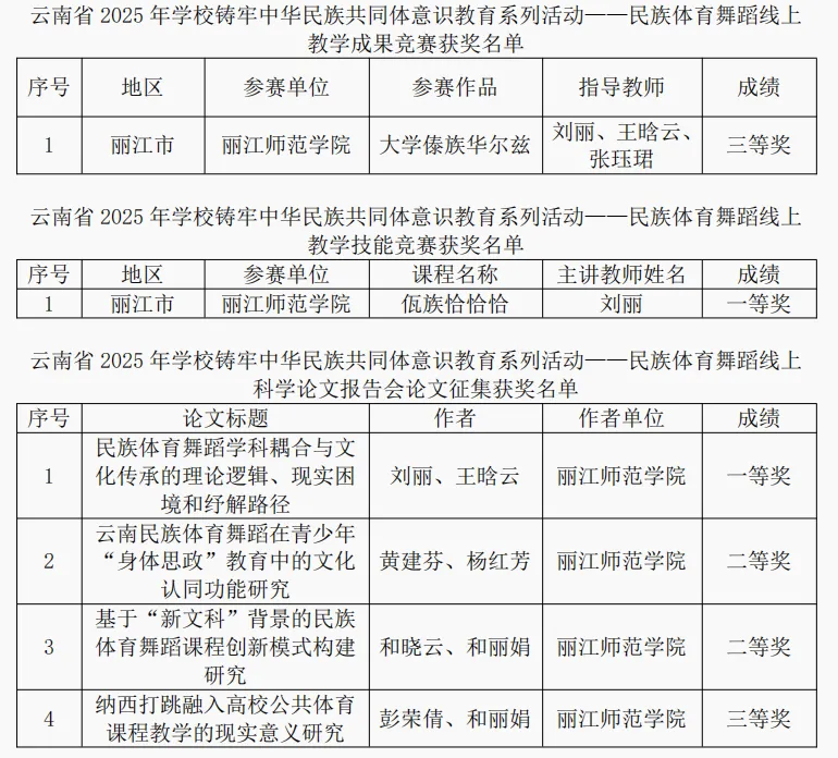 近日,云南省教育厅办公室发布了《关于公布2025年学校铸牢中华民族共同体意识教育系列活动之民族体育舞蹈线上教学和竞赛活动获奖名单的通知》,我院教师在此次活动中取得优异成绩,获评一等奖2项、二等奖2项、三等奖2项。