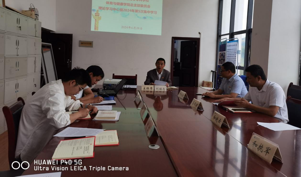 2024年6月28日12:10,在体育馆二楼会议室开展了体育与健康学院党总支理论学习中心组2024年第五次集中学习,参加集中学习的人员有学院班子成员、党总支支委、三办主任、团总支书记。党总支书记刘继忠主持学习。