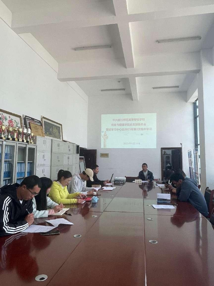 2025年4月18日12:30,在体育馆二楼会议室开展了中共丽江师范高等专科学校体育与健康学院总支部委员会理论学习中心组2025年第二次集中学习,参加集中学习的人员有学院班子成员、党总支支委、三办主任、团总支书记。党总支书记刘继忠同志主持学习。