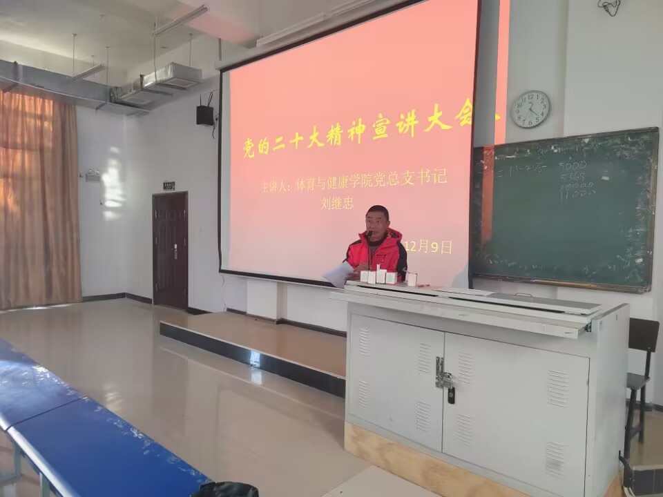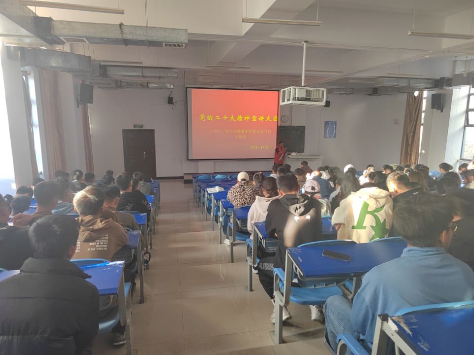 为深入学习宣传贯彻党的二十大精神,把体育与健康学院全体师生的思想统一到党的二十大精神上来,把力量凝聚到党的二十大确定的各项任务上来,2022年12月9日下午16:30,学校宣讲团成员、党总支书记刘继忠对体育与健康学院2021级体育教育专业全体学生开展了以“建功新时代,奋进新征程”为主题的党的“二十大”宣讲报告。宣讲会聚焦“习近平总书记是党中央的核心、全党的核心,习近平新时代中国特色社会主义思想是党必须长期坚持的指导思想;党的十九大以来的重大成就和新时代10年的伟大变革;马克思主义中国化时代化最新成果的世界观和方法论,坚持好、运用好贯穿其中的立场观点方法;中国式现代化在理论和实践的创新突破;贯彻落实党的二十大作出的重大决策部署;以习近平同志为核心的新一届中央领导集体是深受全党全国各族人民拥护和信赖的领导集体;习近平总书记是全党拥护、人民爱戴、当之无愧的党的领袖”,要求同学们深刻领悟“两个确立”的决定性意义,增强“四个意识”、坚定“四个自信”、做到“两个维护”,带头全面贯彻习近平新时代中国特色社会主义思想,自觉在思想上政治上行动上同以习近平同志为核心的党中央保持高度一致。希望同学们深入学习杰出校友张桂梅先进事迹,大力弘扬张桂梅精神,争做“有理想敢担当能吃苦肯奋斗”好青年,踔厉奋发,勇毅前行,奋力推动学校“长大长壮长美”和“发展提升”而团结奋斗。
