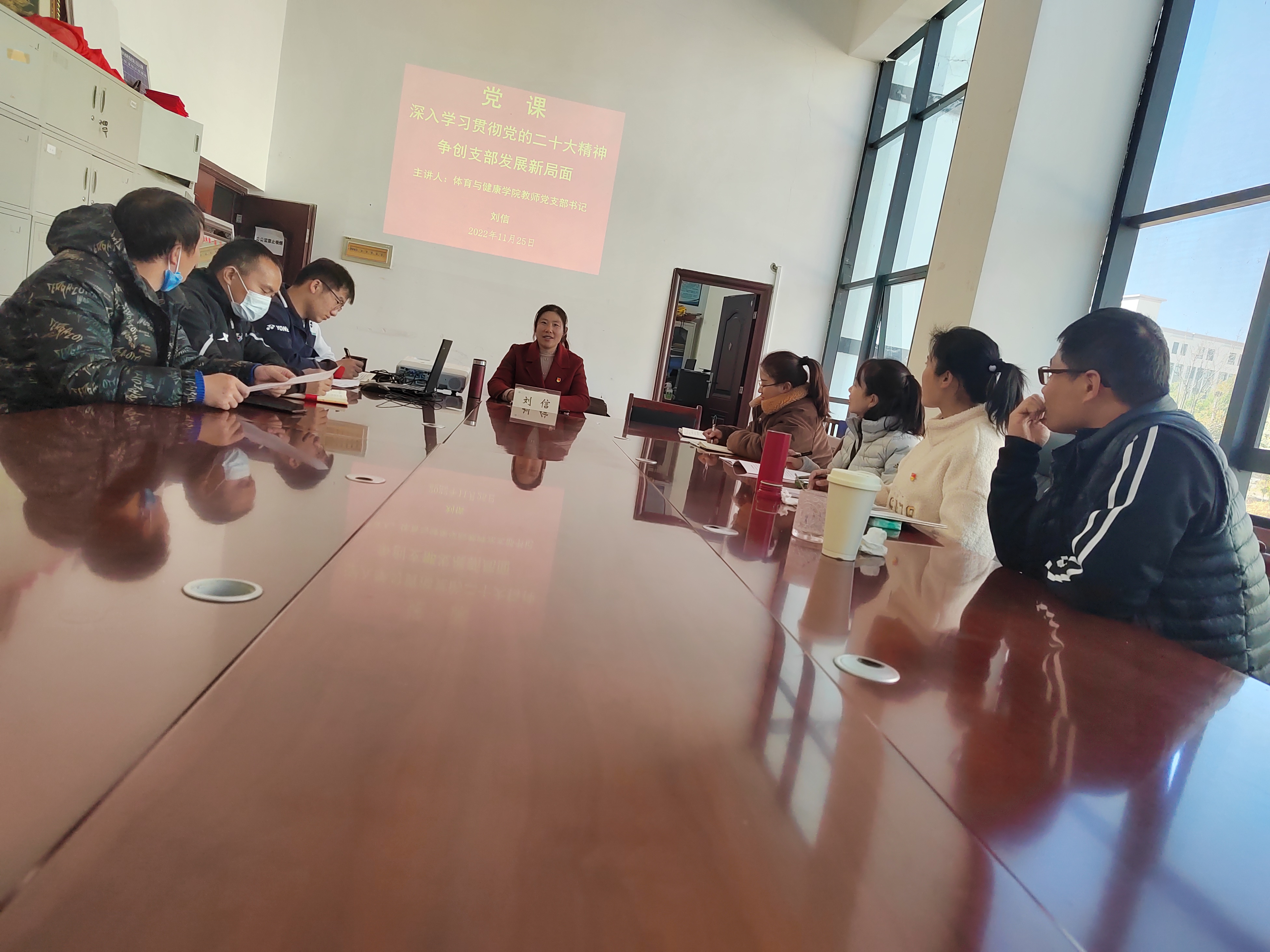 2022年11月25日下午14:00体育与健康学院教师党支部在体育馆一楼会议室开展了题为“深入学习贯彻党的二十大精神,争创支部发展新局面”的支部书记讲党课活动,活动由教师党支部书记刘信同志主持并授课,教师支部全体教师党员参会。