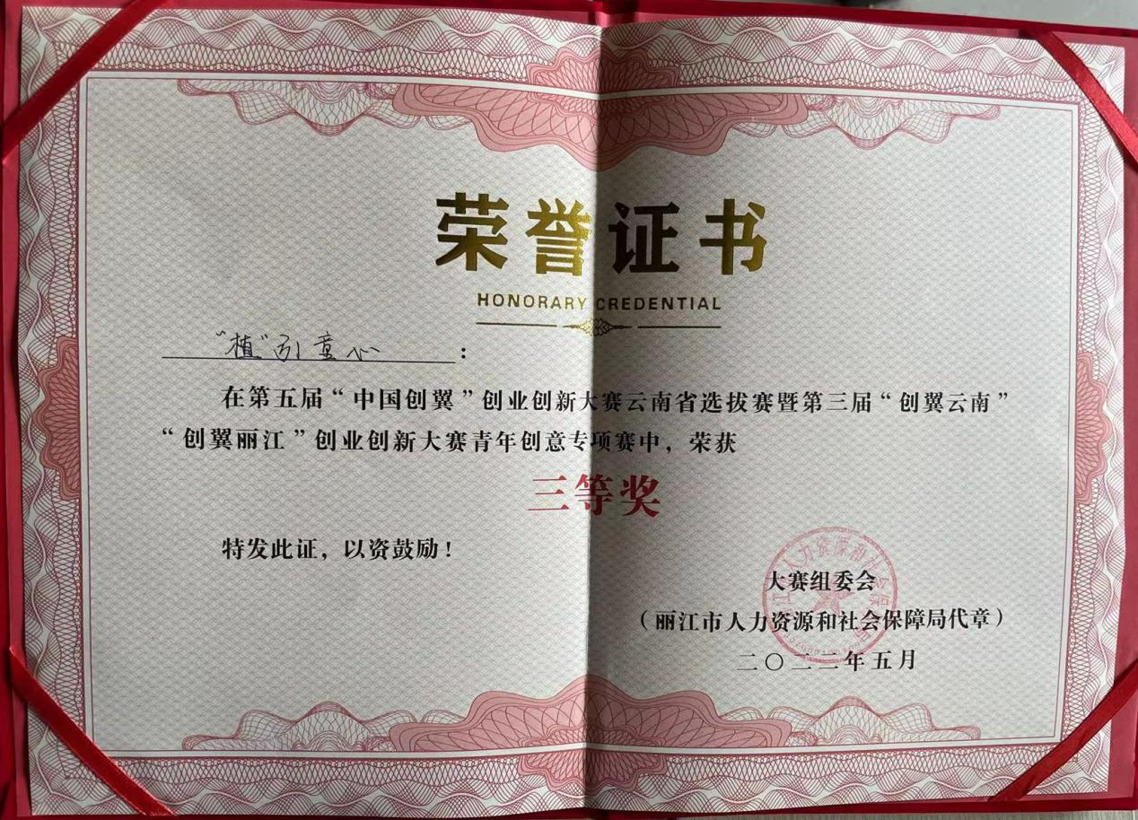 体育与健康学院2020级体育教育2班李华银、角正聪、鲁维、岩应扁、母忠振同学在第五届“中国创翼”创业创新大赛云南省选拔赛暨第三届“创翼云南”“创翼丽江”创业创新大赛青年创意专项赛中以《植引童心》项目荣获三等奖。