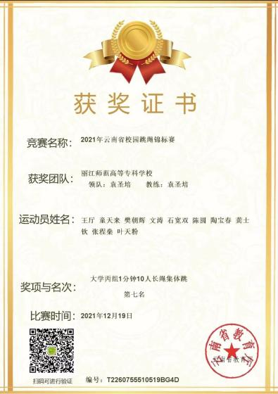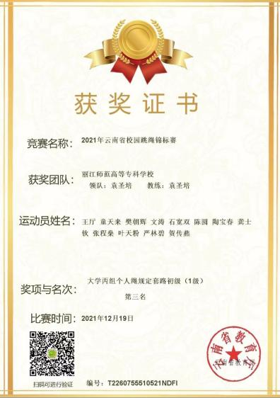 丽江师范高等专科学校跳绳队在施金福老师和袁圣培老师带领下于2021年参加了云南省校园跳神锦标赛,其中童天来、张程燊等12名同学获得大学丙组个人绳规定套路初级第三名;王厅、文涛等10名同学获得大学丙组3分钟10人长绳8字跳第五名;王厅、童天来等10名同学获得大学丙组1分钟10人长绳集体跳第七名;龚士钦、童天来同学获得大学丙组混合2*32秒双摇跳接力第四名;严林碧同学获得大学丙组女子30秒间隔交叉单摇跳第五名;贺传燕同学获得大学丙组女子30秒间隔交叉单摇跳第六名。