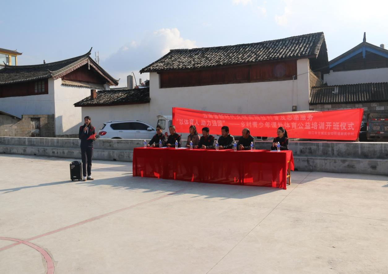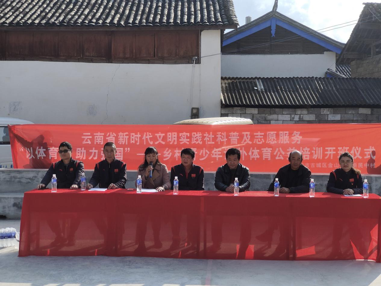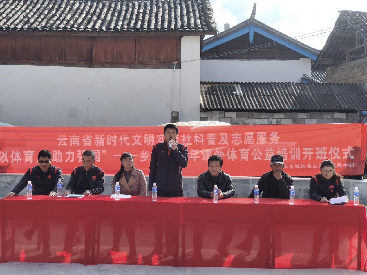 2022年10月22日上午,丽江师范高等专科学校社科普及志愿服务队在古城区金山社区新民中村举行“以体育人 助力强国”—乡村青少年课外体育公益培训志愿服务项目开班仪式。丽江师专党委委员、组织部部长和新梅,党委委员、统战部部长王曙,体育与健康学院党总支书记刘继忠、副院长邢维新、教师党支部书记刘信、学生党支部书记樊月刚、团总支书记彭荣倩、运动训练专业负责人、项目负责人季文,金山街道新民中村村委会党委副书记张学军,新民中村村长杨文生参加了开班仪式。项目组成员、学院综合办公室主任和晓云主持开班仪式。