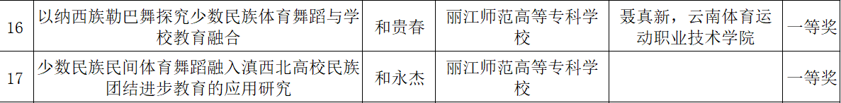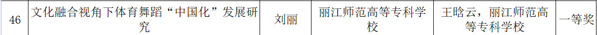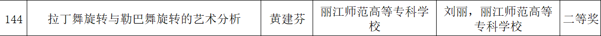 在民族体育舞蹈科学论文报告会论文征集活动中,我院教师和春贵的《以纳西族勒巴舞探究少数民族体育舞蹈与学校教育融合》、和永杰的《少数民族民间体育舞蹈融入滇西北高校民族团结进步教育的应用研究》、刘丽和王晗云的《文化融合视角下体育舞蹈“中国化”发展研究》均获一等奖。黄建芬、刘丽的《拉丁舞旋转与勒巴舞旋转的艺术分析》获二等奖。