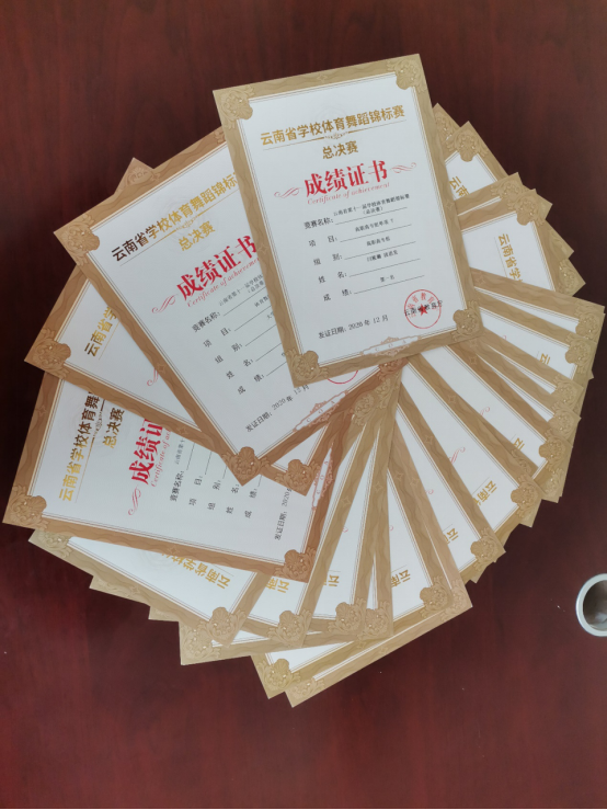 2020年12月,由云南省教育厅主办的2020--2021年云南省第十一届学校体育舞蹈锦标赛(总决赛)在昆明开赛。我校参加了8个项目共21项的比赛。经过激烈的角逐我校在此次比赛中斩获了7个第一名、7个第二名、4个第三名、1个第4名、1个第七名和1个第八名的好成绩。