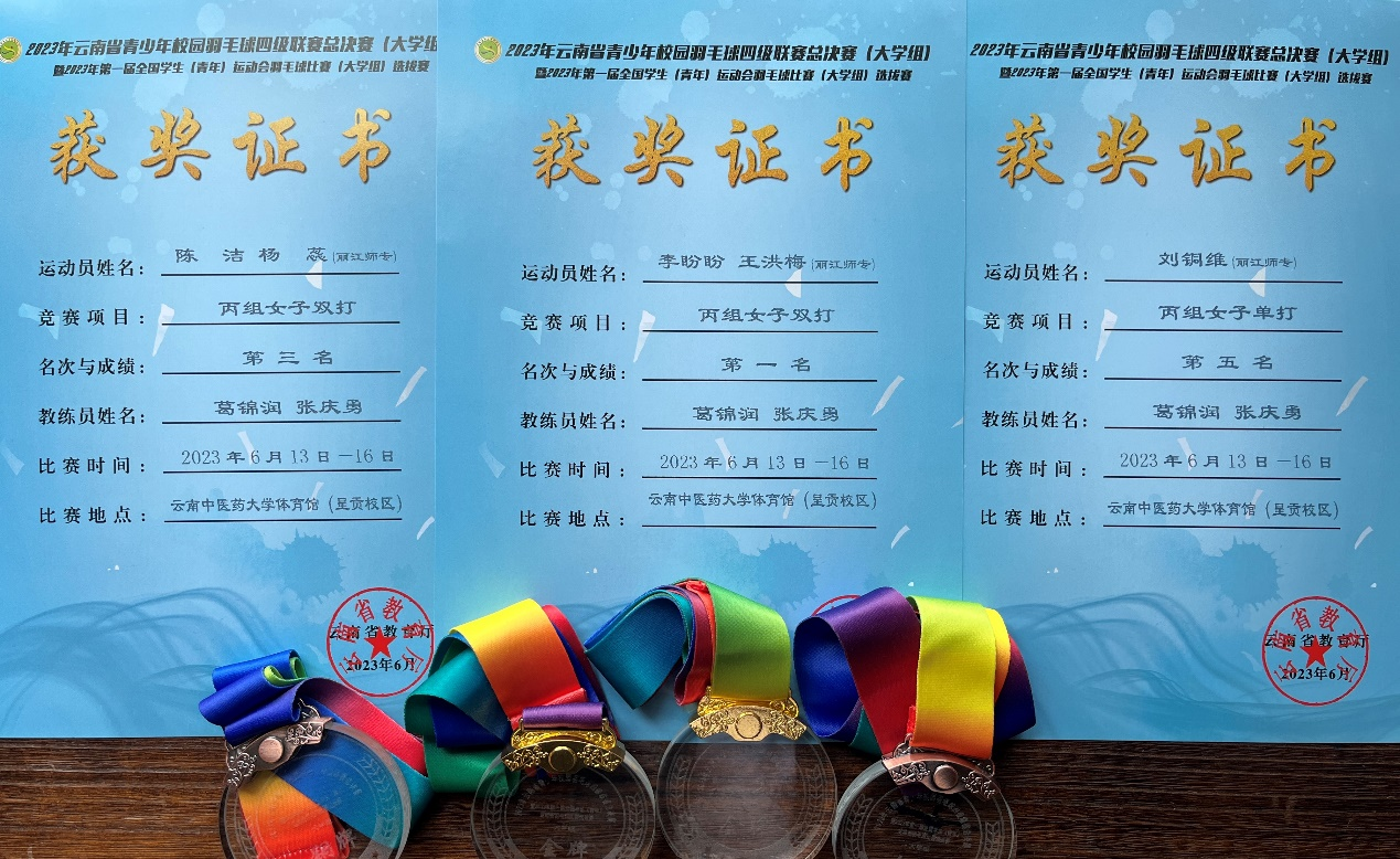 6月13日至16日,云南省教育厅主办的2023年云南省青少年校园羽毛球四级联赛总决赛(大学组)暨2023年第一届全国学生(青年)运动会羽毛球比赛(大学组)选拔赛在云南中医药大学举行,我校组建葛锦润、张庆勇为领队及教练,李国旗、聂杨阳、刘铜维、王洪梅、李盼盼、陈洁、杨蕊为队员的羽毛球队参加甲、丙两个组别三个单项的比赛。据悉,本次比赛吸引了全省38所高校,637名大学生运动员参赛,是近年来参赛人数最多的一届大学组羽毛球比赛。经过奋勇拼搏,丽师羽毛球队获得丙组女子双打第一名、丙组女子双打第三名、丙组女子单打第五名和体育道德风尚奖的好成绩。