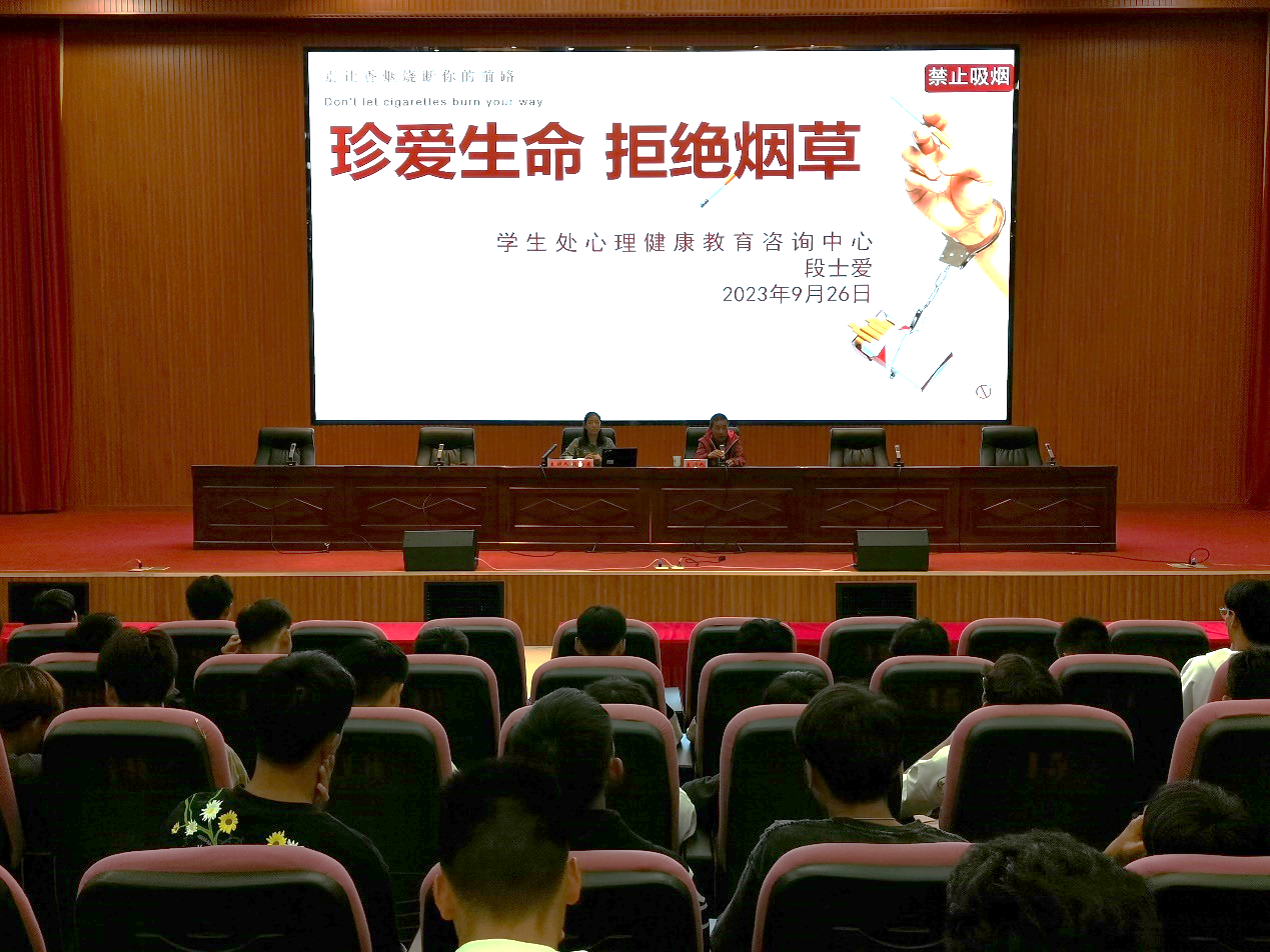 为了促进创建国家文明校园,引导教育师生珍爱生命,远离香烟危害,别让香烟烧断了大好前途,体育与健康学院于2023年9月26日在图书馆报告厅举办了题为《珍爱生命 拒绝烟草》的专场讲座。讲座由学院党总支书记刘继忠教授主持,特邀学生处心理健康教育咨询中心段士爱老师进行主讲,学院在校全部男生聆听了精彩且意义深远的讲座。