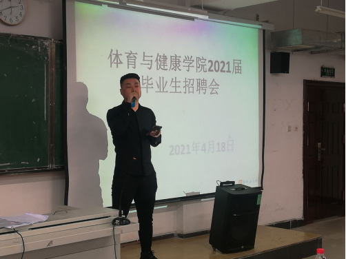 体育与健康学院于2021年4月18日15:00在教学楼222阶梯教室组织召开了我院2021届毕业生首场现场招聘会。参加此次招聘会的用人单位为刘兴刚健身俱乐部和丽江M3连锁健身俱乐部。