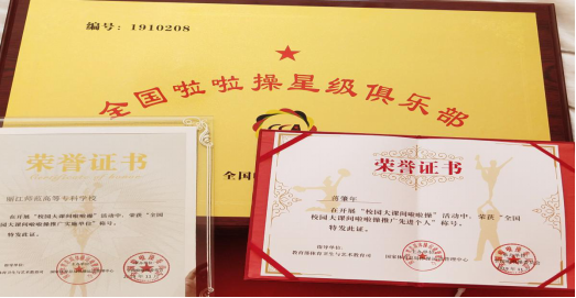 (一) 2019年健身指导与管理专业老师蒋肇年获“校园大课间啦啦操”活动中获“全国校园大课间啦啦操大课间推广先进个人”称号。为我校获得“全国啦啦操校园大课间推广实施单位”的称号。